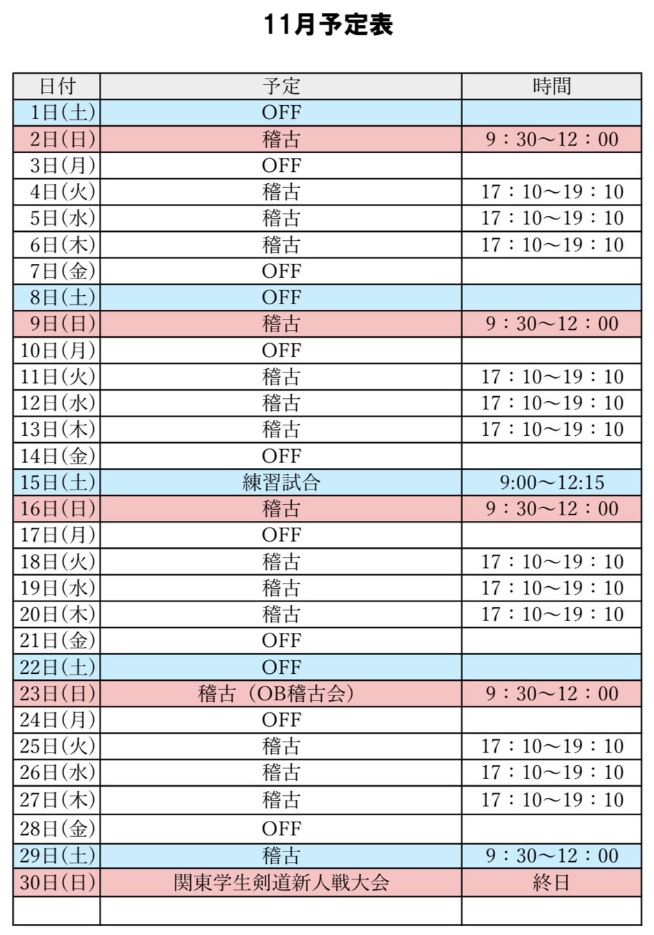 *練習試合等が入り、予定を変更する可能性がございます。