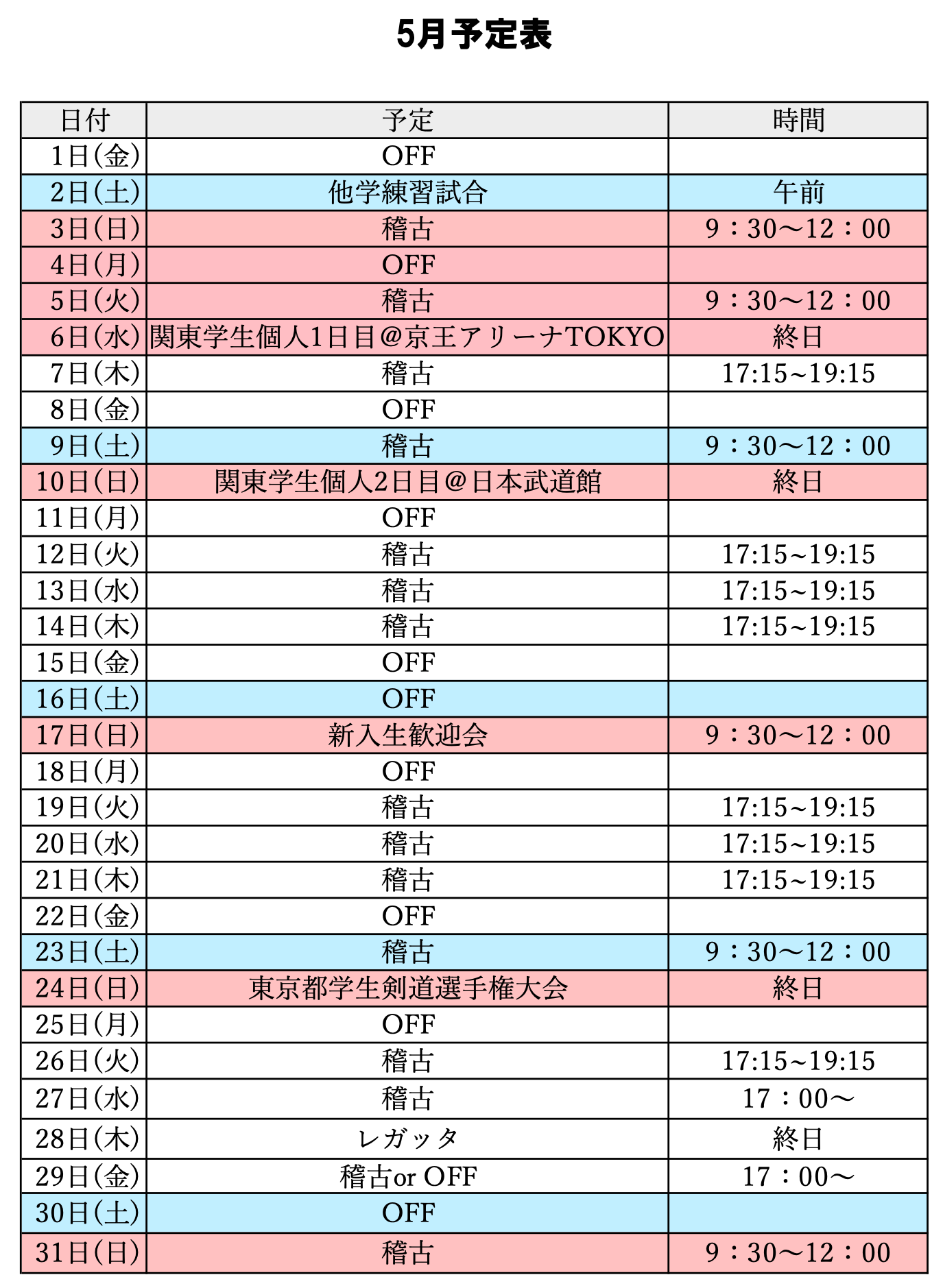 *練習試合等が入り、予定を変更する可能性がございます。